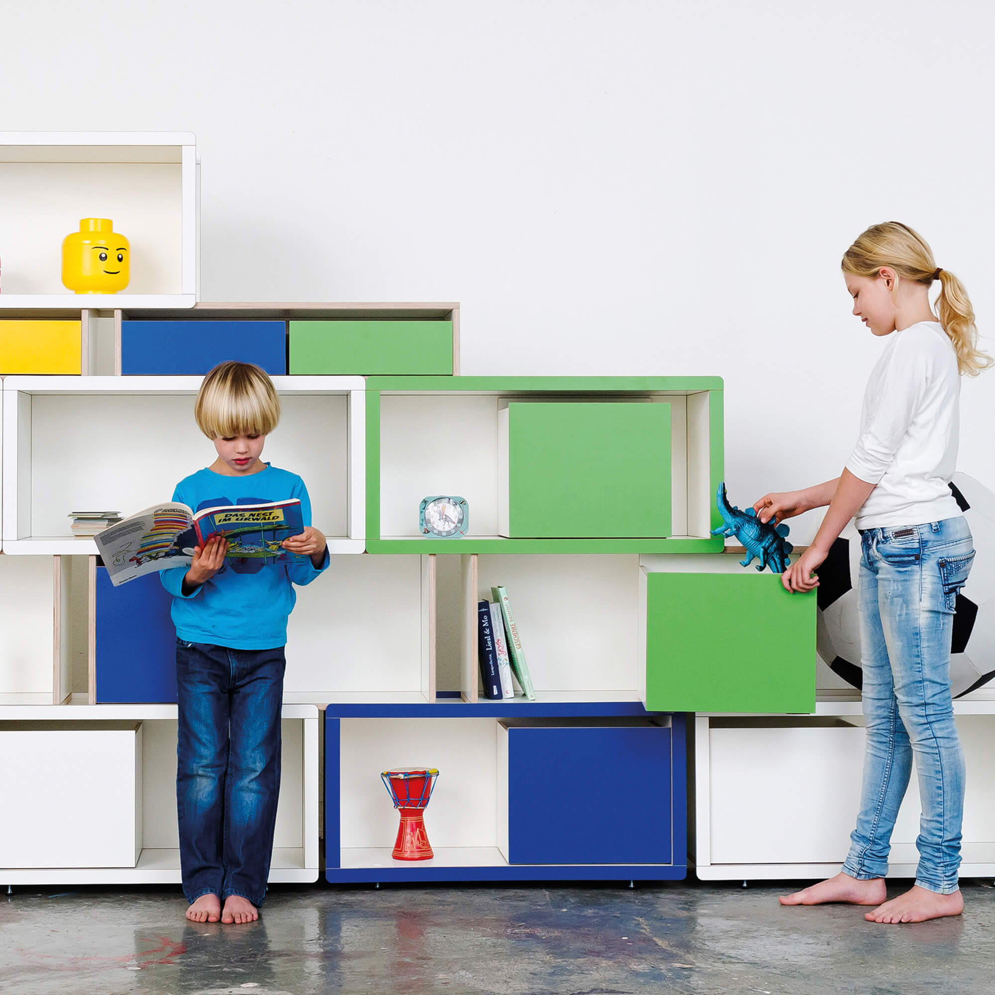 brick for kids ist ein Kinderregal, das als System speziell auf die Bedürfnisse von Kindern zugeschnitten ist. Die Konstruktion ist gewollt reduziert und genial einfach gehalten, ein Verschrauben ist nicht nötig. Alle Elemente lassen sich sowohl in der Höhe als auch in der Breite anbauen und farblich auf die tools für den growing table anpassen.
